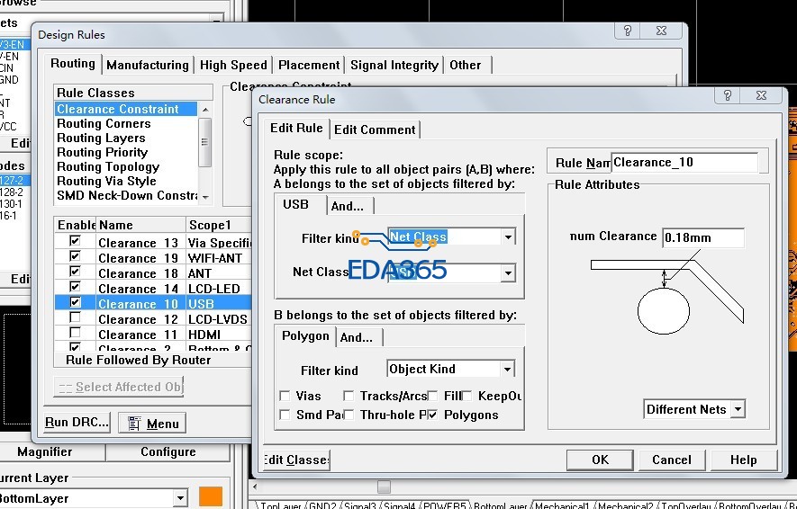 在铺铜时,怎样设定某条走线与铺铜间的安全距离。2-3脚与铜箔的距离宽些
