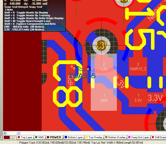 用PU命令在POWER层 以VIA为圆心画一个线宽比较宽一些的圆。