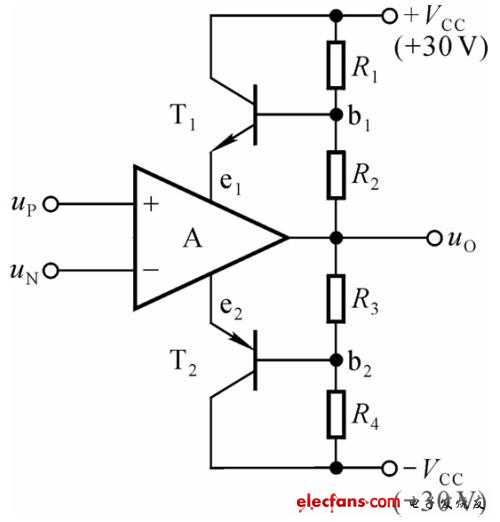 如图静态时,通过参数设置使uo为0,运放的电源电压为±15V。当uo正向增大时,T1趋于导通,管压降减小,Ve1增大; T2趋于截止,管压降增大,Ve2减小;在保证电源电压差值不变的前提下增大了uo的正向变化范围。 Uo反向增大时,作用相类似,增大uo的反向变化范围。求详细解释怎样增大Uo的变化范围的,,,最好直白一点。谢谢各位大侠啊!顶!