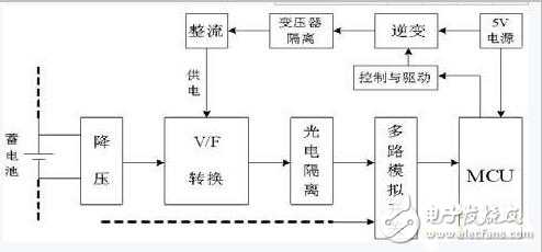 V/F转换法的原理图如下所示,它的工作原理如下:信号采集采用V/F转换的方法,单节蓄电池采用分别采样,取单节蓄电池的端电压经分压(降低功耗)后作为V/F转换的输入,分压电阻的分散性可通过V/F转换电路调整V/F转换信号输出通过光电隔离器件送到模拟开关,处理器通过控制模拟开关采集频率信号。数据采集电路与数据处理电路采用光电隔离和变压器隔离技术,实现两者之间电气上的隔离。但采用V/F转换作为A/D转换器的缺点是响应速度慢,在小信号范围内线性度差,精度低。