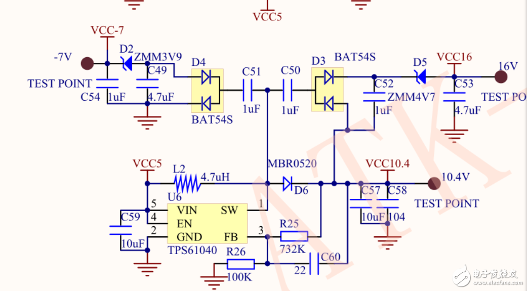 tps61040升压IC输出10.4V,3脚是电压反馈端。