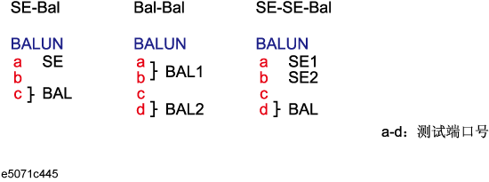 通过打开平衡 - 不平衡转换功能,可以选择平衡端口的不平衡参数作为测量参数。以下三个图 显示了测量每个平衡设备时可以选择的不平衡参数。