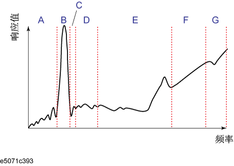 例如,要评估具有传输特性的带通滤波器(如下图所示),您可以从 A 到 G 中选择所需的频段,并确定测量条件(如下表所示)。这样可以在一次扫描操作中同时对它们进行测量。