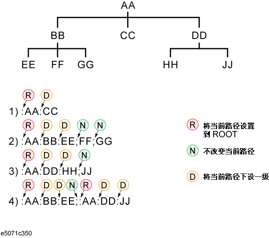 E5071C 所指定的命令。该命令包括了E5071C的所有测量功能和一些通用功能。命令以命令树的层次结构排列。每个命令包含许多字符串(助记符),层与层之间以冒号分隔(:)。