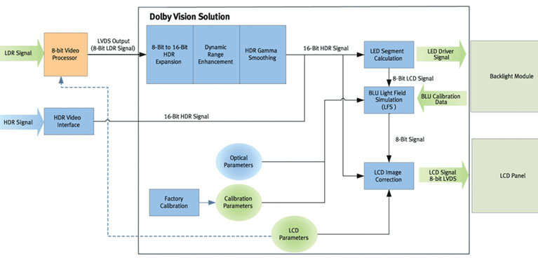 杜比视频科技增加了先进的高动态范围处理技术。将8比特视频帧扩展到16比特帧,实现了图像灰度动态补偿。除了其他的一些杜比对比度的处理外,杜比视频科技基于LED背光和一些显示参数,还实现了LCD图像生成补偿。