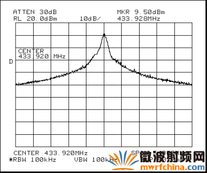 图4和图5分别示出了ASK发送器IC使用100kHz和30kHz测量带宽时的测量频谱,调制信号采用数据速率为19.2kbps的方波信号。计算出的功率电平和测量功率电平之间的差异是由相位噪声、VCO瞬态牵引和"峰值保持"测量技术造成的。使用30kHz的分辨带宽可以使功率测量值从-25dBc降至-30dBc,从而增加了满足发射带宽要求的裕度。