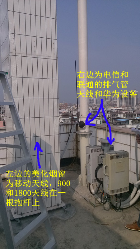 在现场发现移动天线(美化烟窗)旁边有这些天线(排气管)和设备,只看到是华为设备,但不清楚是电信设备还是联通设备,望大家指教指教,谢谢!