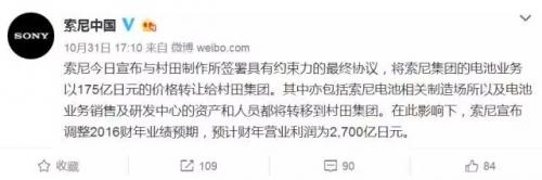 据索尼中国官微的最新报道,"锂电池"之父索尼宣布与村田制作所签署具有约束力的最终协议,将索尼集团的电池业务以175亿日元(约11亿人民币)的价格转让给村田集团,并将于2017年3月底完成转让。