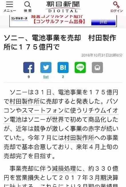 随后,日本朝日新闻也刊载了索尼将电池业务打包卖给村田集团的文章。据悉,此次索尼卖的只是锂离子电池,干电池(纽扣电池)及民用消费级电池业务还是被保留下来了。