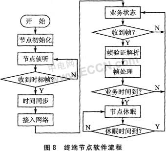 如图8所示,终端节点在初始化成功后进入信道扫描侦听状态,当侦听到有邻居节点活动时便向邻居节点请求时标帧;节点依据接收到的时标帧同步自己的时钟,节点时钟同步后进入接入状态,接人成功后节点进入业务状态。处于业务状态的节点,执行后台和Sink节点发布的命令,进行数据的传感采集与传输,以及对邻节点数据的中继转发。节点为了实现低功耗,必须在业务状态与休眠状态之间进行轮换。