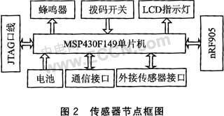 图2为传感器节点的框图,该节点使用电池供电,体积小巧,只有打火机般大小。