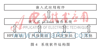 基于μCLinux操作系统的硬件驱动和应用程序的开发是在交叉编译环境中进行的,首先在PC机上开发,然后移植到目标机上进行调试并最终固化到目标机上。所开发的硬件驱动有以太网卡控制器驱动、LCD驱动、HPI驱动等驱动程序。系统软件结构如图4所示[5]。