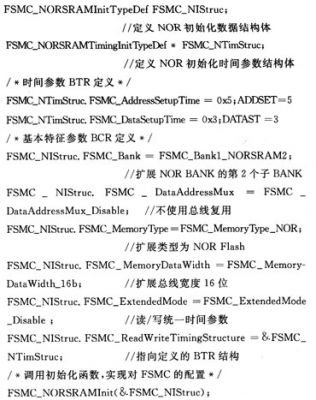 数据结构FSMC_NORSRAMTimingInitTypeDef对应时间参数寄存器FSMC_BTR和FSMC_BWTR的结构定义;FSMC_NORSRAMInitTypeDef对应特征配置寄存器FSMC_BCR的结构定义,并包含2个指向对应BANK的FSMC_BTR和FSMC_BWTR寄存器的FSMC_NORSRAMTimingInitTypeDef结构指针。