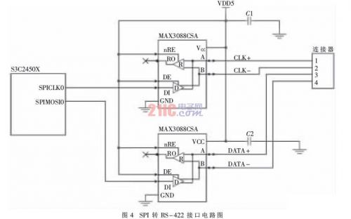 图4中将S3C2450X的SPICLK0和SPIMOSI0引脚分别接到2个MAX3088的DI引脚上,DE和RE接5 V直流电源,A和B为差分信号对输出,C1、C2为旁路电容。由于只使用SPI的发送功能,所以忽略了SPIMISO0引脚。