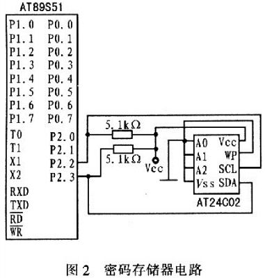 电路中选用AT24C02作为密码和开锁信息的存储器,该存储器是一款具有I2C总线接口的串行EEFROM,由于AT89S51单片机没有I2C总线接口,在电路上选用单片机的P2.2、P2.3分别与AT24C02的SCL和SDA线相连,软件上实现模拟I2C总线接口。在该存储器中还保存着用户修改后的一级、二级权限密码和最近20次开锁的具体时间,以及非法偷、套密码的提示信息,用户通过按键可方便的实现查阅。存储器与单片机的连接如图2所示。鉴于该系统在功能上要求实现密码输入提示、开锁信息的查阅、时间显示等信息,并从低成本出发,故选用SMCl602A液晶显示模块作为显示电路,其电路结构如图3所示。