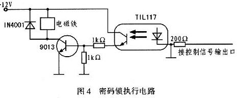 执行电路通过单片机其中1个引脚线发出信号,经三极管放大后。由继电器驱动电磁阀动作将锁打开的方案,电路结构如图4所示。另外,报警电路采用时基集成电路555及其辅助元件构成,在联网的情况下,报警信号可通过串口扩展网络发给主控制器,提醒管理人员注意。
