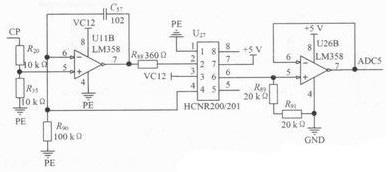 电压测量首先需要通过测量互感器将电压和电流转换为可以测量的小信号。例如对220V的电压信号的测量,采用的互感器变比为2 mA/5 mA,采用图4所示的电路,可知在220V时互感器的输出恰好为5mA。忽略大电阻分流的影响,则27 Ω相当于是一个采样电阻。由于采样的信号为交流电,信号有正负之分,而A/D转换器的输入范围为0~3.6V,所以不能直接将采样电压输入到A/D转换器中。在运放的正输入端接入一个正的参考电压,再选择合适的放大倍数,使输出能够在A/D转换器的输入范围即可很好的解决该问题。采用准同步采样后,数据采用矩形自卷积窗算出其有效值。