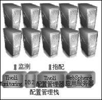 IBM的蓝云计算平台由数据中心、IBM Tivoli配置管理器、IBM Tivoli Monitoring、IBM Websphere应用服务器、IBM DB2和虚拟组件构成。所有的请求都由Web 2.0组件来处理。然后转发到Tivoli配置管理器,进行服务器的分配或解除分配。