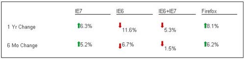 根据该统计数据显示,在过去六个月中,IE 7和火狐的占有率都有不同程度的上升。火狐的市场占有率增长了6.2%,这是它自2006年以来增长最快的一次。而IE 7的增长速度则紧跟其后,增长了5.2%,但是微软的另一个浏览器IE 6则在这段时间内下降了11.6%。