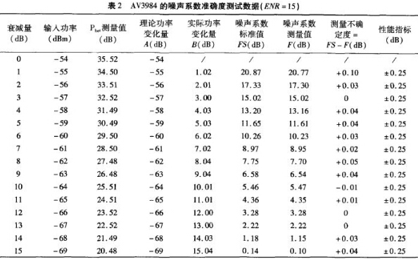 依据图4所示连接实验仪器,AV3984的噪声系数性能指标为±0.25 dB,测试数据如表2所示。