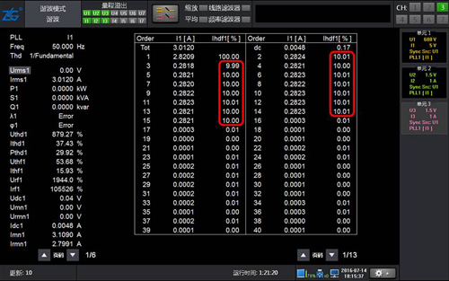 图5、50Hz基波2~15奇次含量10%常规谐波分析结果