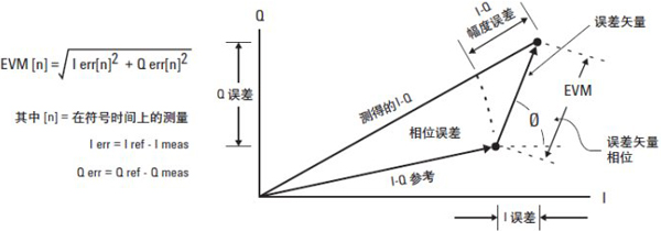 在数字通信系统中应用最为广泛的调制质量指标是误差矢量幅度(EVM)。误差矢量是指在给定时间的理想参考信号和所测信号之间的矢量差。参见图12。误差矢量是一个复参量,包含幅度和相位分量。不要将误差矢量幅度与幅度误差、误差矢量相位与相位误差相混淆。