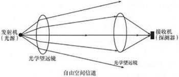 一个光无线通信系统构成如图1所示,包括三个部分:发射机、信道和接收机。光发射机的光源受到电信号的调制,并通过作为天线的光学望远镜,将光信号经过空间送到接收端的望远镜。高灵敏度的光接收机,将望远镜收到的光信号再转换成电信号,值得注意的是,发送端和接收端之间,必须是互相视线可见的,两终端之间不能有阻挡。由于大气空间对不同光波长信号的透过率有较大的差别,可以选用透过率较好的波段窗口。光无线系统通常使用0.85μm或1.5μm红外波段。0.85μm的设备相对便宜,一般应用在传输距离不太远的场合。1.5μm的设备价格要高一些,但在功率、传输距离和视觉安全方面有更好的表现。1.5μm的红外光波大部分都被角膜吸收,照射不到视网膜,因此,相关安全规定允许1.5μm波长设备的功率可以比0.85μm的设备高2个等级,1.5μm波长的光无线通信具有更广阔的使用前景。