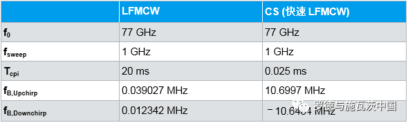 表1:使用LFMCW 和CS信号的77 GHz 雷达,以及目标采用50m/s径向速度且距离在40米范围内的预期差频。