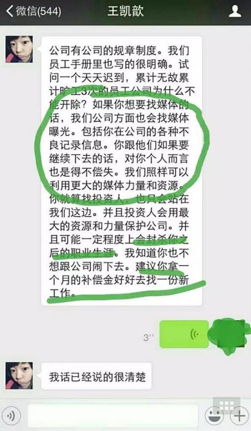 某前员工被莫名辞退后找王凯歆维权,竟遭到威胁: