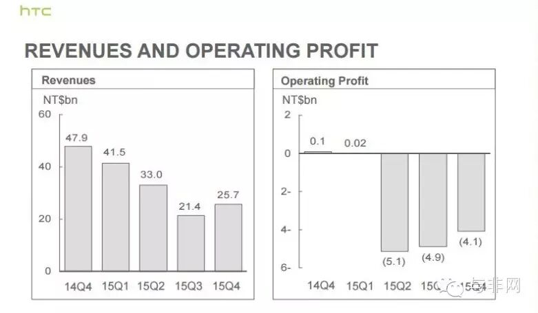 日前,HTC公布的财报显示,2015年四季度,HTC单季营收257亿元新台币(约为50.35亿元人民币),毛利率为13.9%,营业损失41亿元新台币(约为8亿元人民币),税后净损34亿元新台币(约为6.66亿元人民币)。