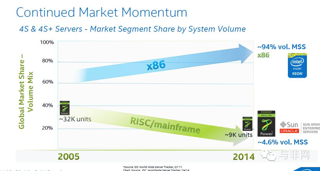 近十年,英特尔统治服务器芯片市场。压倒AMD之后,目前英特尔服务器芯片市场份额已经超过99%(注,原文采用数据如此,编辑尚未查到相关统计数据,但估计此份额应该是只统计X86市场),若谷歌的高通服务器订单属实,这将是英特尔统治地位的首个潜在威胁