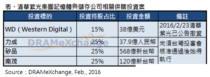 DRAMeXchange 研究协理杨文得表示,紫光集团原计划透过入股 WD 带动后续晟碟的购并案,以间接获得相关 NAND Flash 的发展契机。随着美国外资投资委员会以"Exon-Florio Amendment"国防修正案的理由挡下入股案后,清华紫光集团在后续 NAND Flash 关键技术的投资将势必修正布局方向,后续发展值得关注。