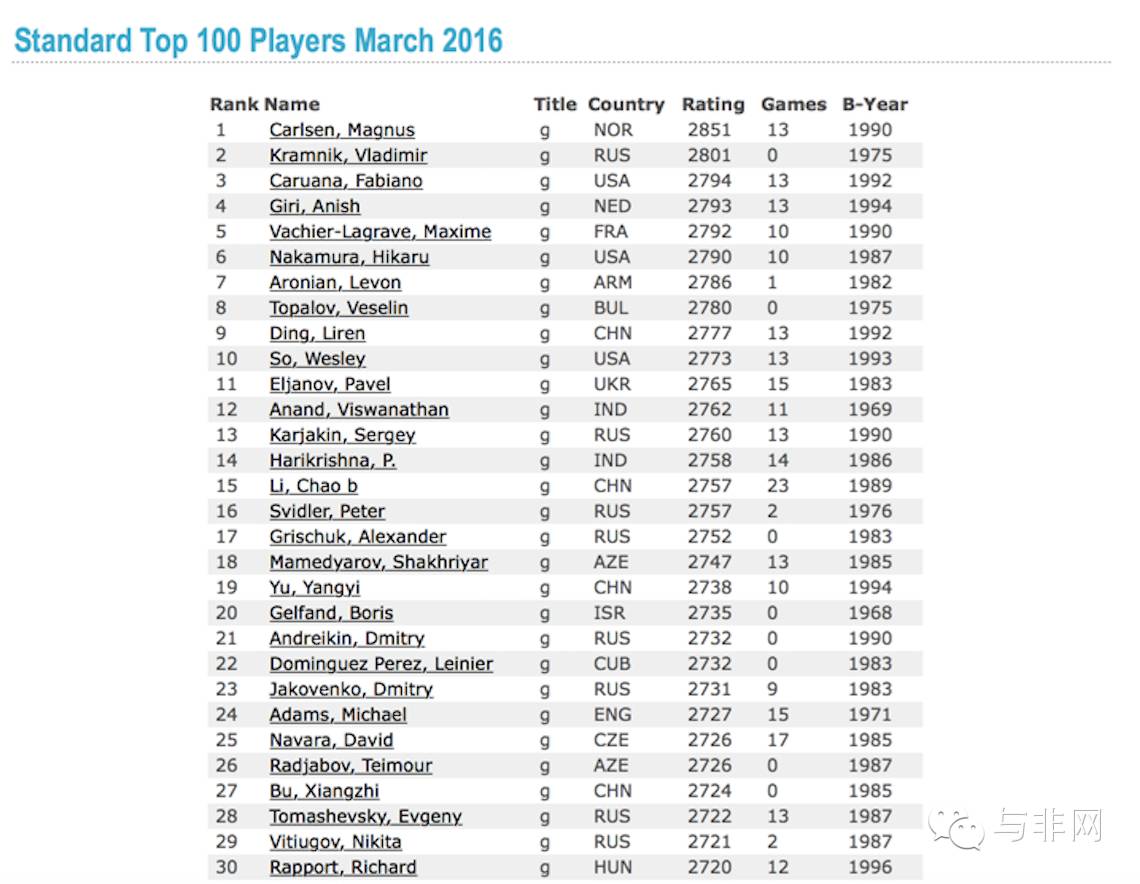 人类前30名国际象棋选手等级分状况