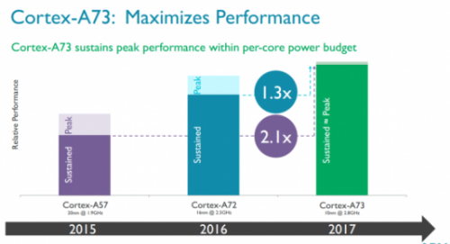 根据数据显示,和前代Cortex-A72相比,Cortex-A73功效提升30%,性能也提升了30%。而新一代的图像处理引擎Mali-G71性能提升了50%,功效也提高了20%以上,无疑这将提高移动芯片对VR的支持。特别是功效的提升至关重要,因为最终移动VR的显示将没有太大差别,功耗将成为影响用户体验的主要因素。