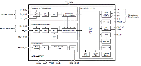 ON Semiconductor’s AMIS−49587 is an IEC1334 compliant power line carrier modem using spread−FSK (S−FSK) modulation for robust low data rate communication over power lines. AMIS−49587 is built around an ARM 7TDMI processor core, and includes the MAC layer. With this robust modulation technique, signals on the power lines can pass long distances. The half−duplex operation is automatically synchronized to the mains, and can be up to 2400 bits/sec.