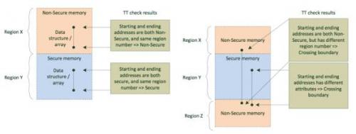 TT指令将来自地址值的安全属性和区域号(还有MPU的区域号)返还原软件。如果在存储段的起始和终止地址上使用TT指令,并确定两个地址都处于同一个区域号内时,软件便可迅速判断存储范围(如数据阵列或数据结构)是否完全位于非安全空间。
