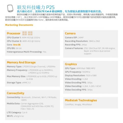 Helio P25依然采用16nm工艺制造,号称功耗比上代产品降低25%,规格为八核心Cortex-A53,大核心主频为2.5GHz,GPU和P20一样为Mali-T880 MP2,主频900MHz,最高支持6GB LPDDR4X内存。