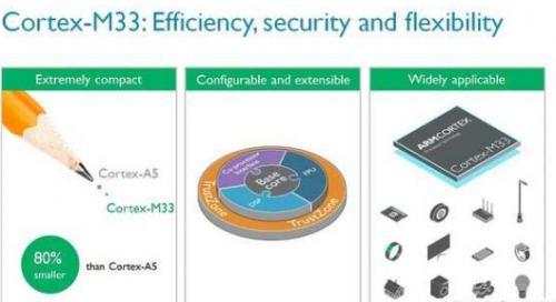 Cortex-M33核心将是保护各种嵌入式应用的泛用型32位MCU处理器。 其体积比ARM Cortex-A5缩小80%,成为所有支持TrustZone技术的处理器中最小巧的芯片。 它的用途非常多元–单处理器就能覆盖各式各样的功能。 它提供可自设的支持,包含TrustZone、DSP、浮点运算等技术,支持各种先进音效与连网堆栈。 它的新型协同处理器接口,可用来扩增紧密耦合的客制化处理功能,同时仍保有工具产业体系的所有利益。