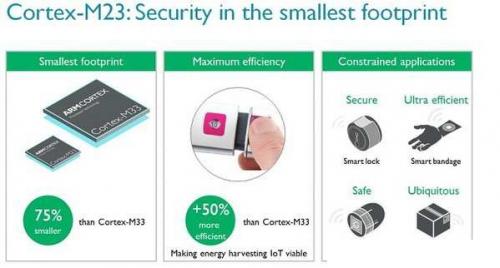 Cortex-M23体积更小,事实上它比新推出的Cortex-M33还小75%,而且省电性比Cortex-M33高50%,因此运行时更省电,续航力更久。 它专为微型化、超省电的物联网与嵌入式产品量身设计。 它将功能性延伸至各种体积最小、功耗最低的装置,不仅为它们提供安全性,更提升效率、效能、以及扩充性,能在各种限制最严苛的情境中进行部署。