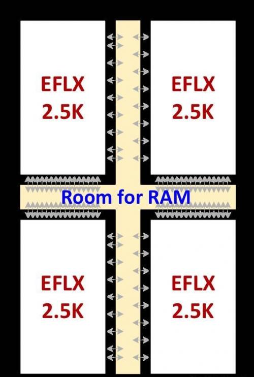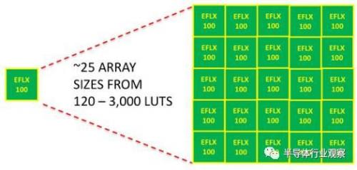 EFLX-100阵列的规模为5x5或3,000个LUT(在EFLX-100中实际上有120个LUT)。