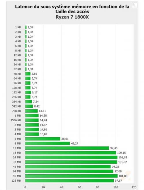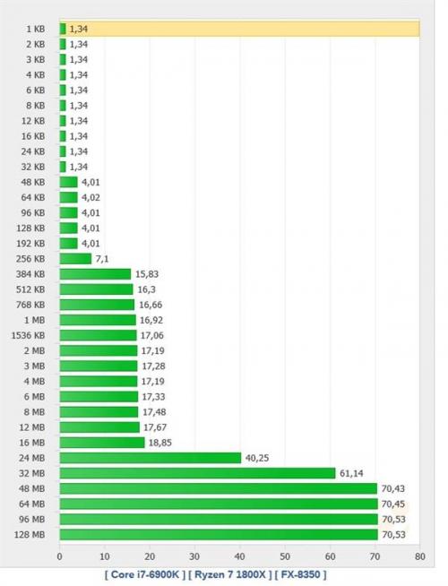 在针对L3缓存性能的测试当中,在相同内存配置和同样3GHz主频设定下,Ryzen 1800X的内存延迟结果为90ns,比Intel i7-6900K和自家FX-8350K的60ns都要高。