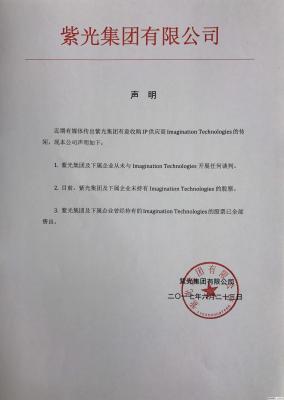 据了解,紫光集团被代入联想的原因是 2016 年其曾经取得 Imagination 3% 股权。在第一时间与紫光集团联系获知,目前紫光集团及其下属企业曾经持有的 Imagination Technologies 的股票已全部售出,也未参与 Imagination Technologies 的任何谈判中。具体声明如下: