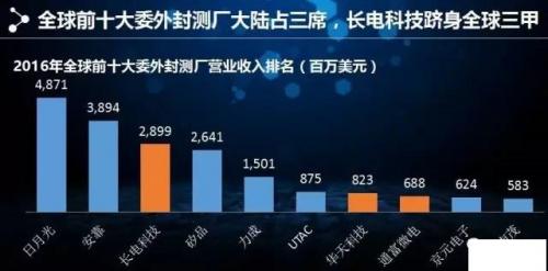 据TECH Search的数据,长电科技2016年度营收为28.99亿美元,位居全球封测企业第三名。