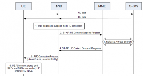eMTC/NB/LTE中,用户上下文释放既可以由eNodeB发起也可以由MME发起。这一释放流程不仅释放S1-AP信令连接(S1-MME),同时也释放S1-U承载。而对于eMTC/NB中的CP优化模式,这一流程之间释放了S11-U承载。由于某些特殊的原因,例如S1信令传输丢失或者eNodeB/MME某个网元的问题,用户上下文可以在某个网元进行本地释放,这样就不需要使用或者依靠如下图网元之间的信令流程了。