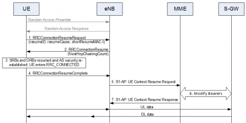 借鉴了GSM主辅载波的概念,NB-IoT分为锚定载波(anchor carrier)和非锚定载波(non-anchor carrier),锚定载波承载NPSS/NSSS/NPBCH/SIB-NB等一系列的的同步,系统消息。这意味着UE在IDLE态只能驻留在主载波上进行下行同步和系统消息侦听。而非主载波则通过专属信令流程指明。UE在锚定载波进行初始随机接入,而通过专属信令指明的非锚定载波进行数据传输,那么哪些流程会指派非锚定载波呢?先上一张图。