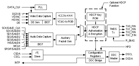 动辄几百毫瓦的功耗问题一直是便携式产品在引用HDMI接口的主要技术瓶颈,Analogix的ANX7150拥有极低的功耗和极强的兼容性,其优越性能足以满足便携式电子产品的要求,ANX7150同时支持HDMI1.2和HDCP1.1标准,它支持高达165Mpixel/s的像素读取率,其灵活的视频输入接口支持高达24位的RGB/YCbCr 4:4:4/4:2:2、4:2:2至4:4:4上采样/下采样,以及YCbCr至RGB色彩空间转换。集成了先进的数字音频,为Dolby Digital和DVD音频提供8通道I2S支持。它还为PCM、Dolby Digital和DTS环绕声格式和数字音频传输提供S/PDIF协议支持,其音频接口允许可编程的I2S通道映射(channel mapping)。