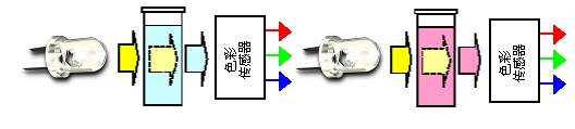 可以使用透射传感,确定透明介质的颜色,如玻璃和透明塑料、液体和气体。在这种应用中,光穿过透明介质,然后撞击在色彩传感器上。透明介质的颜色取决于对色彩传感器电压的理解。