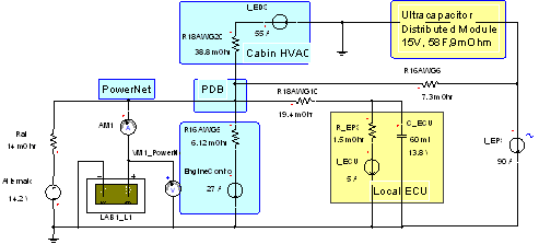 上图与前一张PowerNet电路图相同,但是,增加了放置在EPS负载点的超级分布式模块。这个超级模块是一个标准的汽车设计产品,它在大的用电负载附近像电池一样提供稳定和平滑的PowerNet。所有其它地方一样,存在超级分布式模块的地方,就可以容易地在PowerNet和ECU电压上观察到平滑作用。