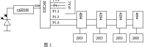 接收器部分,主要由CX20106和89C2051、显示驱动4094、2803及数据存储器和看门狗25045组成,用解码芯片CX20106把38K的载波过滤后,得到一组波形,即以波特率为1200的串口数据,直接送至89C2051的RXD接收,用软件读取串口,输入缓存,得到一组数据,判断正确后,存放在非易失性的EEPROM25045中,同时直接用脉冲移位方式,送数据至4094,经2803驱动后显示,同时用25045的看门狗定时,保证在程序失控等情况下,能正确返回而不造成错误接收。由于串行口方式传输,本身带有奇偶校验和起停位校验,可以大大提高数据的可靠性,同时在数据组中还加入了累加和校验,再次提高了可靠性,因此在实际应用中,即使在露天、太阳直射、光照很强等恶劣环境下,都能保证不会误收数据而造成显示错误。其原理图如下:
