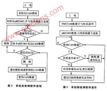 上电后,首先对CAN模块进行初始化。然后初始化nRF2101,并与接收端建立连接。当发送完CAN数据后没有收到ACK信号时,就跳频;然后通知发送端准备接收重发的CAN数据,直到接收到ACK信号。